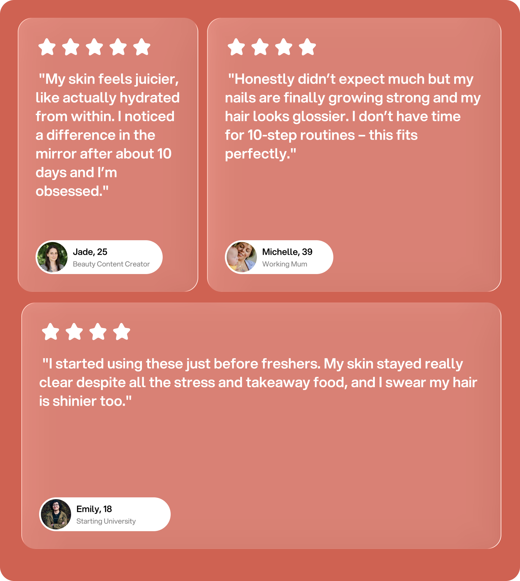 "Honestly didn’t expect much but my nails are finally growing strong and my hair looks glossier. I don’t have time for 10-step routines this fits perfectly."