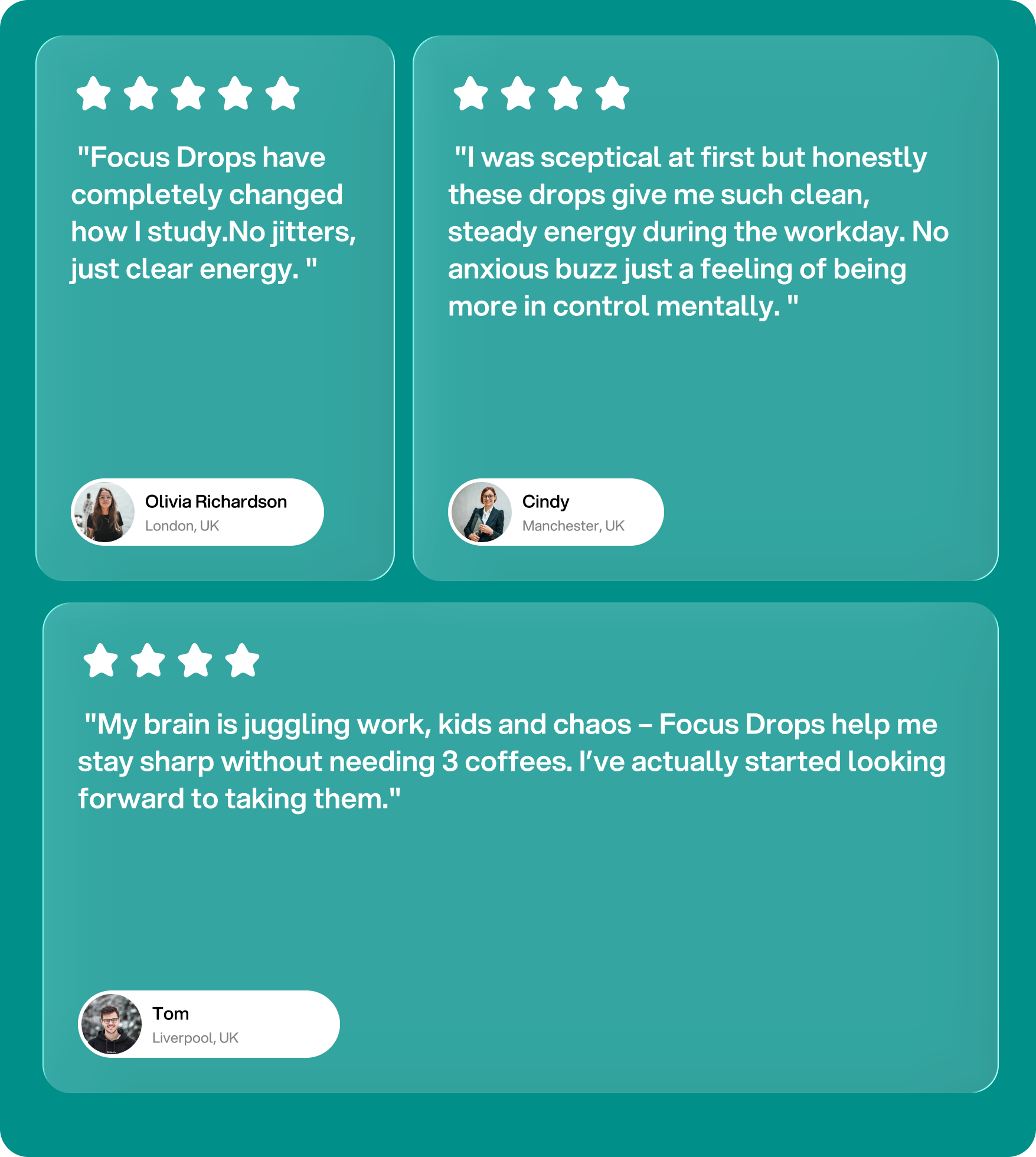 "My brain is juggling work, kids and chaos – Focus Drops help me stay sharp without needing 3 coffees. I’ve actually started looking forward to taking them."